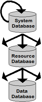 Finally, the Data Database contains application data, which requires the database schema defined in the resource database for being accessed.