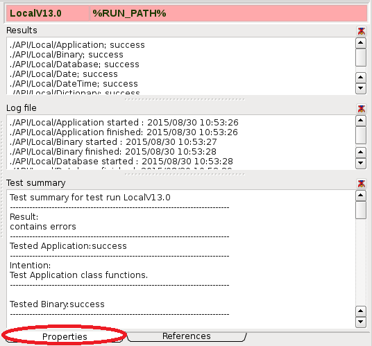 All fields display file content of files stored in the test run directory. One may change the field content, which automatically will change the file content. In order to clear result list, log file or test summary, the clear button right above the field may be clicked.