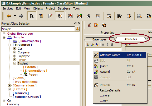 For defining new attributes, the attribute wizard might be called from the attribute list, which can be activated by clicking the Attributes tab on the Members tab for the selected data type.