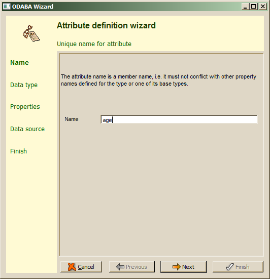 Attribute names have to be unique within the members defined for a data type and its base types. Attribute names are technical names and must not contain special characters or spaces except underscores. After filling in the attribute name, Next should be pressed in order to continue. When the attribute name is not correct or has already defined as member for the data type or one of its base types, an error will be displayed in the wizard's message area.