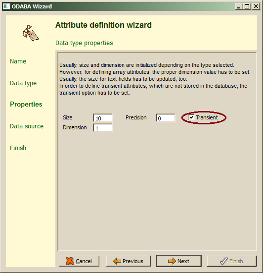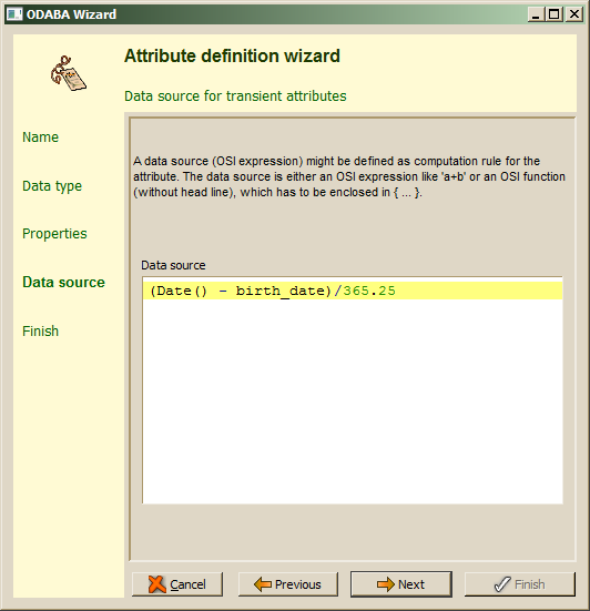 The data source definition step is shown only, when the attribute has been defined as transient attribute. There are, typically, two ways of computing values for transient attributes. One is the doAfterRead() handler for the data type. The other is defining a data source expression using OSI. When defining a data source via expression, the attribute value will be evaluated only, when accessing the attribute, which is more efficient than calculating the value in a read handler.