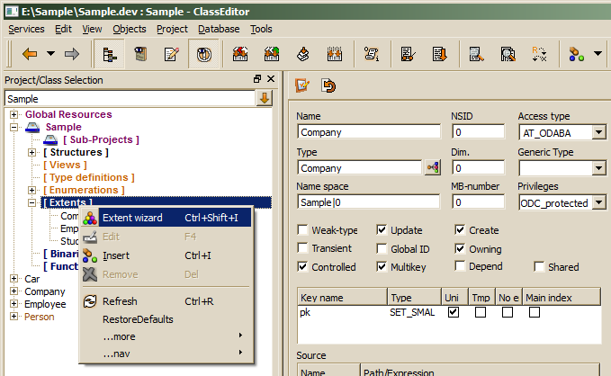 A detailed description for different collection types is available in ODABA-base documentation topic Reference documentation/ODABA Model reference/Data model/References. For defining new extents, the extent wizard might be called from the class tree after selecting an entry in the [ Extents ] region.