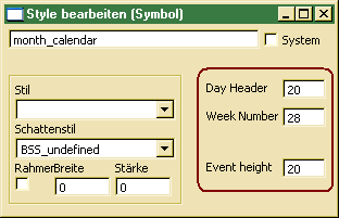 On top of the month control there is an area for displaying the abbreviations for day names. The height of this area may be defined in Day Header. In order to suppress day names, the day header height may be set to 0. On the left calendar side week numbers are displayed. The width of this area is defined in Week Number. Setting this value to 0 will suppress week numbers. The Event Height defines the height of the area for displaying an event title.