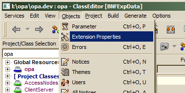 In order to open the extension property dialog select Objects/Extension Properties from the ClassEditor or Designer application: