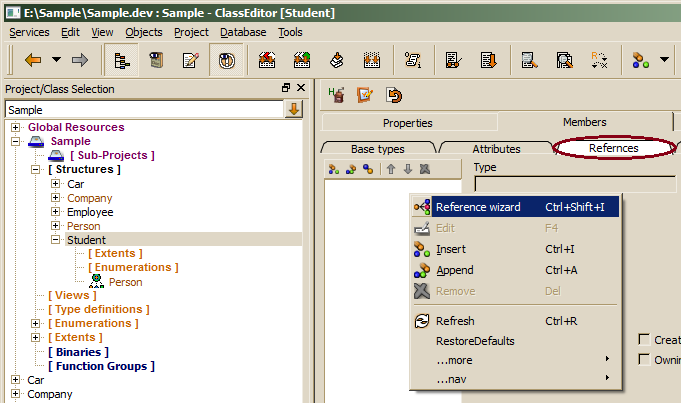 ODABA distinguishes between references, which describe a part-of relationship and relationships, which define associations between objects. Thus, referenced instances belong exclusively to the structure instance referring to them and cannot be referenced from any other location. Typically, references are used for defining large text fields or transient references of different kind (see also ODABA-base documentation Reference documentation/ODABA Model reference/Data model/References. For defining new references, the reference wizard might be called from the reference list, which can be activated by clicking the References tab on the Members tab for the selected data type.