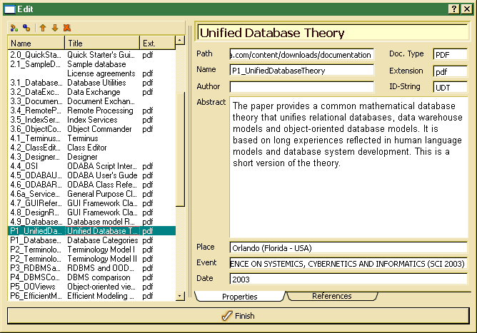 In order to edit document references, one may click Objects/Document References in the main menu. The document reference browser shows the list of all document references: