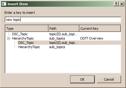 A name need not to be provided, when creating a subtopic. When inserting a hierarchy topic, a name has to be defined. When a hierarchy topic with the given name does already exist, the existing hierarchy topic will be inserted at the current position in the tree. When no such hierarchy topic exists, a new hierarchy topic will be created. When the option Options.Documentation.AutoInitialize.AutoCreate is set to YES, a new topic definition is created automatically and linked to the hierarchy topic.