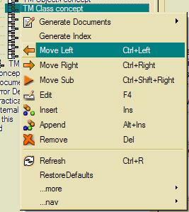 In order to turn a topic into a subtopic, Move Sub (Ctrl-Shift-left) might be selected from the context menu. This action will copy the named topic to a sub topic. The named topic will be removed.