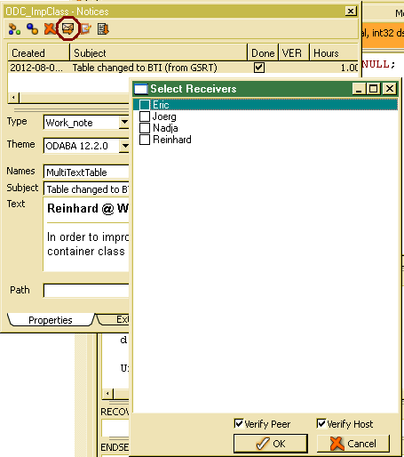 The list of team members shows all users (Objects/Users) that have been registered in the resource database with email address. By choosing the sen mail button in the notice form toolbar, the sender selection dialog pops up. After selecting one or more team members, the notice will be sent.