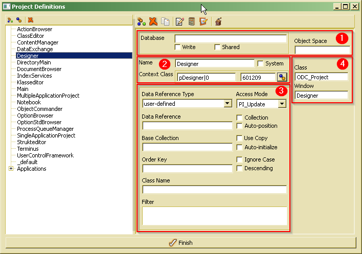 In order to open the hierarchy tree for browsing or updating project and/or application actions, the project dialog has to be opened by selecting Objects/Projects from the Designer's main menu or tool bar: