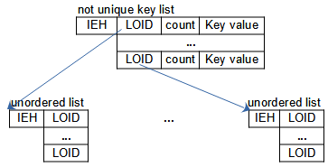 Unordered list entries do not contain key values, but the instance LOID, only, in this case to instances with the same key value. Key entries in the not unique key list contain the LOID pointing to the unordered list and the count of entries in the referenced unordered list.