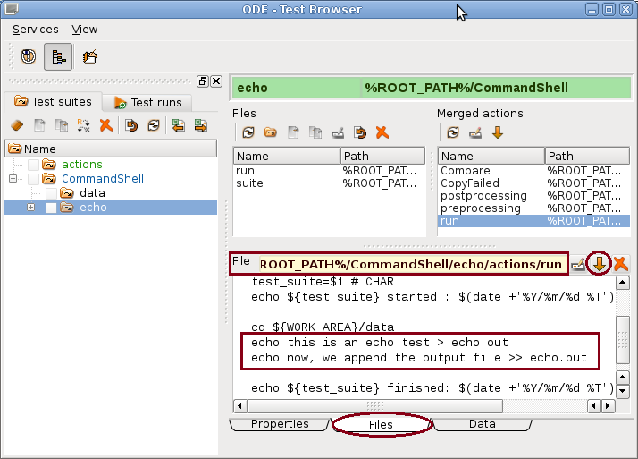 The Merged actions list contains all actions inherited from upper test suites (in this case from the main_suite). When changing data as inserting the two echo lines in the example, the action will be localized automatically, i.e. the updated action will be stored in the actions directory for the selected test case. This is also the case for Merged data and Merged expected lists shown when selecting the Data tab.