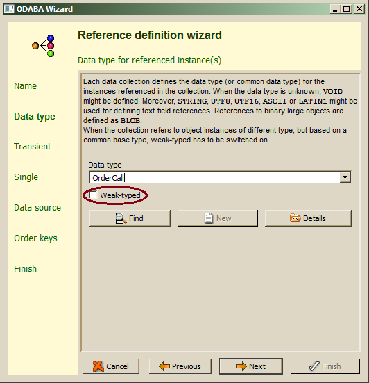 When instances with different data types are to be stored in the reference (collection), all referenced instances must inherit from the data type defined in the Data type field and Weak-typed has to be enabled. In order to store instances of any type in the collection, VOID has to be defined as data type and Weak-typed must be switched on.