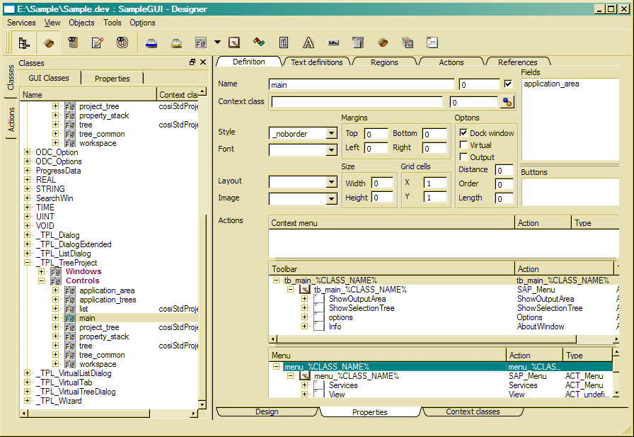In the pattern example above you will find option references in the toolbar and menu definition. Actions containing option references as CLASS_NAME will cause creating a copy from the action when applying the template to a design class and replacing the option by the class name of the class to be initialized.