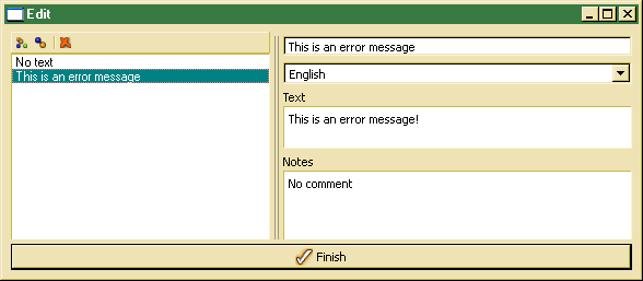 Text entries may be created more simple by marking the text to be translated in the code editor (ClassEditor or Designer) and using the shortcut Ctrl++ (Ctrl and +). Then, the text entry will be created and the text entry editor pops up for translating the entry. By default, the selected text will be added to the English text version. By selecting other languages from the language drop list, text entries for other languages may be added.