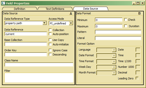 Data source definitions might be defined in a similar form by activating the Properties tab below the work area andselecting the field in the Designer's class tree below the control to be designed. Here, filter conditions and data formatting can be defined in addition. The data source definition form consists of two parts: