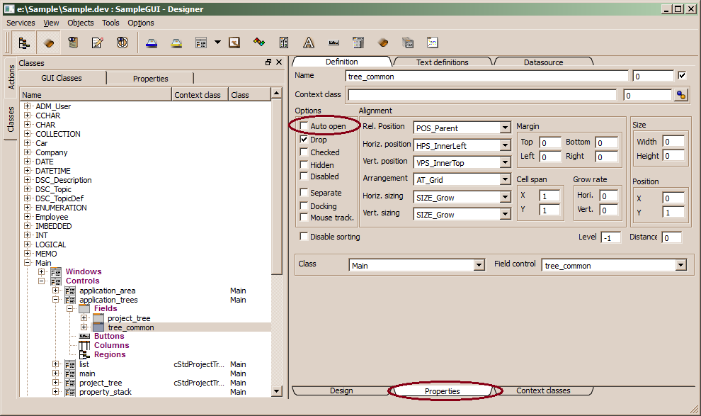 In order to deactivate, e.g. the second tab, you switch to the Properties view (down tab), select the field tree_common in control application trees and deactivate the Auto-open check box (right). When you test the application again (Test window), the tree area shows only one tabs.