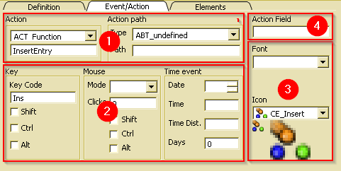 An event action is defined by combining an action definition (1) with one or more event definitions (2). In case of visible action items, additional layout information may be added (3). For defining controls as part of a toolbar action, an action field (4) may be defined.